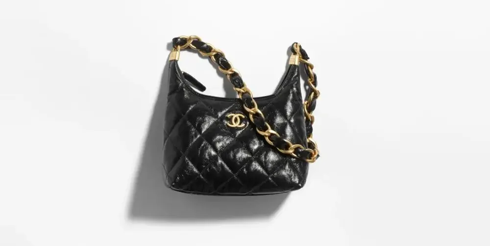 The Chanel Mini Hobo Bag in black patent quilted leather is small, shiny, and very recognizable. It’s a bit different from the classic flap bags—more relaxed, less structured, and easy to carry.